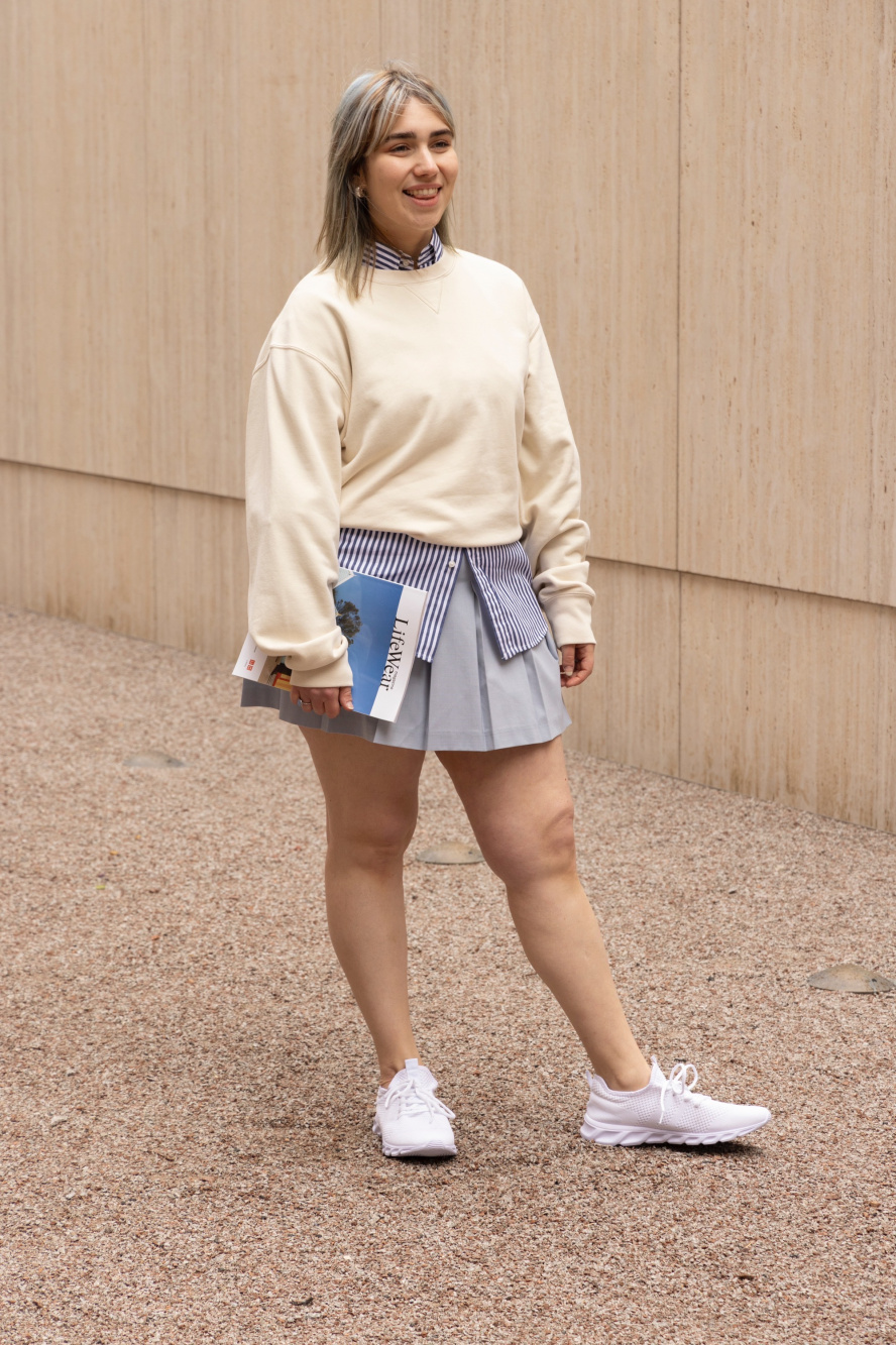 - sweatshirt and skirt outfit